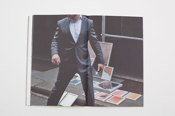 Kruithof started “Pixel Stress” with a simple Google search for images related to this alerted state of our sympathetic nervous system. The main search results presented stock images of men and women in suits staring at computer screens, collapsed over their desks loaded with paperwork, and heads-in-hands. Kruithof ultimately chose fourteen of these images which she first appropriated and cropped and then enlarged to their maximum size (3200% in Photoshop) in order to print and frame them. On April 18th of 2013, she and two assistants brought these abstracted grids of morphing, pixilated color to sidewalks of Wall Street, where they set up an installation under a temporary scaffolding and tried to engage pedestrians, mostly business men in their lunch breaks, with the displayed works. Depending on the pedestrians’ willingness to look and interact, Kruithof initiated conversations about her pixilated abstractions, the meaning of the project and potential interpretations of the works (quotes of which are included in the publication).