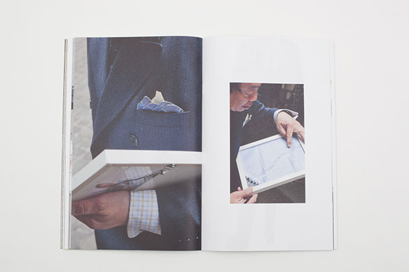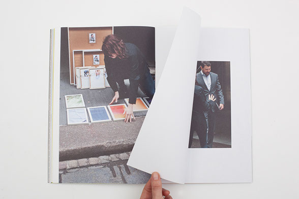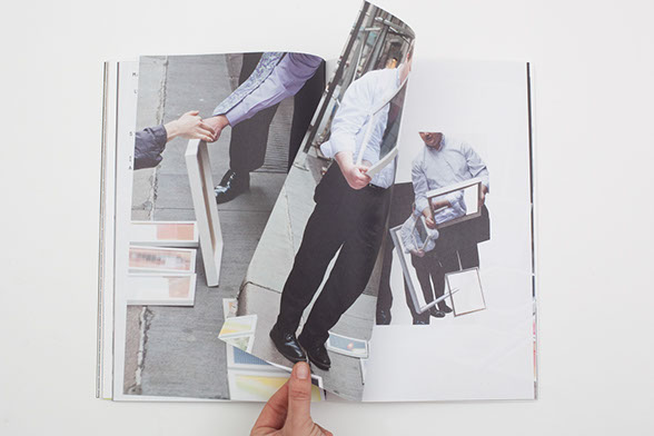 “Pixel Stress” is a successful book in spite of, and possibly because of its ‘incomplete exchanges’. Smooth high gloss paper reproduces the tiny thumbnails of the original internet images that sit like little stickers on open white backgrounds. These thumbnails explode into pixilated close ups the moment you flip the page. All of these pages are folded into a loose binder which is album-like and held together by an elastic band. It actually takes skilled hands to keep the book together while you make your way through it. In the center, a stapled paper insert documents Kruithof’s Wall Street installation, including snippets of her conversations, as well as pictures of the interactions and transactions that are cropped or manipulated into multiple photocollages. The men in suits are cut in half or decapitated; their shirts are merging with the white frames and pixel-grids. Kruithof appears in some of the pictures, moving back and forth, arranging her works and communicating. What is most striking about all of these images is their emphasis on gestures: predominantly hands that point, compare and evaluate; grasp and hold; at times even touch; that interact and communicate. These hands ask questions and tell invisible stories.